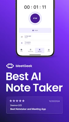 MeetGeek هو تطبيق مسجل صوت ومدون ملاحظات ذكي يعتمد على الذكاء الاصطناعي. يمكّنك MeetGeek من تحويل الكلام إلى نص وتسجيل الصوت بدقة عالية بأكثر من 50 لغة مختلفة. اجعل اجتماعاتك، محاضراتك، ومقابلاتك أكثر إنتاجية وسهولة مع MeetGeek، مساعدك الشخصي في تدوين الملاحظات الصوتية.