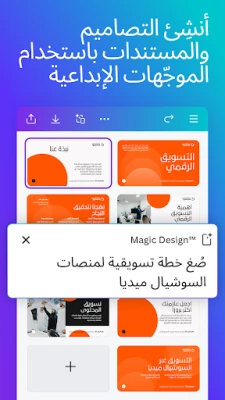 تتجاوز إمكانيات Canva مجرد التحرير لتصل إلى آفاق جديدة بفضل ميزات MAGIC المدعومة بالذكاء الاصطناعي. اسمح لـ Magic Design بتحويل صورتك الخام إلى تصميم متكامل بذكاء، أو استخدم Magic Edit لتبديل العناصر وإضافة تفاصيل جديدة بلمسة واحدة، أو أزل أي شيء غير مرغوب فيه ببراعة Magic Eraser. ولا تنسَ ميزة Translate التي تتيح لك ترجمة تصاميمك تلقائياً لأكثر من مئة لغة. سواء كنت تصمم لافتات إعلانية جذابة، منشورات لوسائل التواصل الاجتماعي (إنستغرام، فيسبوك)، دعوات احترافية، أو تبني هوية علامتك التجارية بشعار فريد، يوفر لك Canva مكتبة محتوى ضخمة تضم ملايين الصور والفيديوهات والمسارات الصوتية والخطوط، بالإضافة إلى أداة تحويل النصوص إلى صور لابتكار محتواك الخاص.