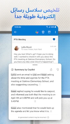 لم تعد إدارة مهامك اليومية معضلة. يقدم **Outlook for Android** بيئة عمل متكاملة تمكنك من إنجاز كل ما تحتاجه بلمسة واحدة. اسحب المستندات الضرورية من مكتبة ملفاتك الرقمية وأرفقها برسائلك الإلكترونية دون عناء، واستفد من التكامل السلس مع تطبيقات مثل Word وExcel وPowerPoint للعمل بكفاءة أينما كنت. هكذا يتحول جهازك المحمول إلى مركز إنتاجية متنقل يلبي احتياجاتك الاحترافية والشخصية، مما يجعل العمل أثناء التنقل أكثر سهولة ومرونة من أي وقت مضى.