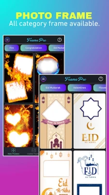 مع FramePro، يتوفر لك كنز من الخيارات لتزيين صورك. استكشف مجموعة غنية من إطارات الصور الأنيقة التي تتراوح بين الأنماط الكلاسيكية والرومانسية، وحتى التصاميم المستوحاة من الطبيعة والجمالية البسيطة. إلى جانب الإطارات، يقدم FramePro مكتبة واسعة من قوالب الملصقات الجاهزة للاستخدام في المناسبات الخاصة مثل ملصقات عيد مبارك، ورأس السنة، ورمضان، ويوم النصر. سواء كنت تصمم لمنشور على فيسبوك، أو قصة على إنستغرام، أو حالة واتساب، فإن FramePro يضمن لك تصاميم جذابة وملفتة للنظر تتناسب مع كل منصة.